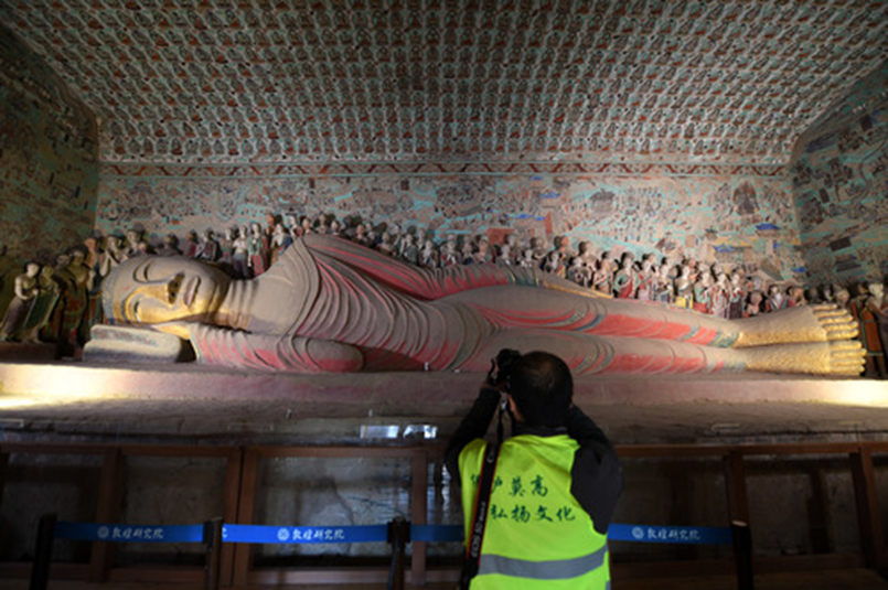 2016年10月11日,百名攝影師分組分批走進甘肅敦煌莫高窟洞窟內(nèi)部進行攝影創(chuàng)作,領(lǐng)略莫高窟神韻。圖為當日,攝影師在敦煌莫高窟第148窟拍攝臥佛。新華社記者范培珅攝