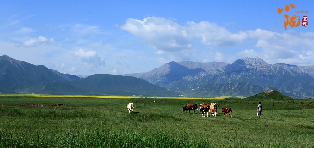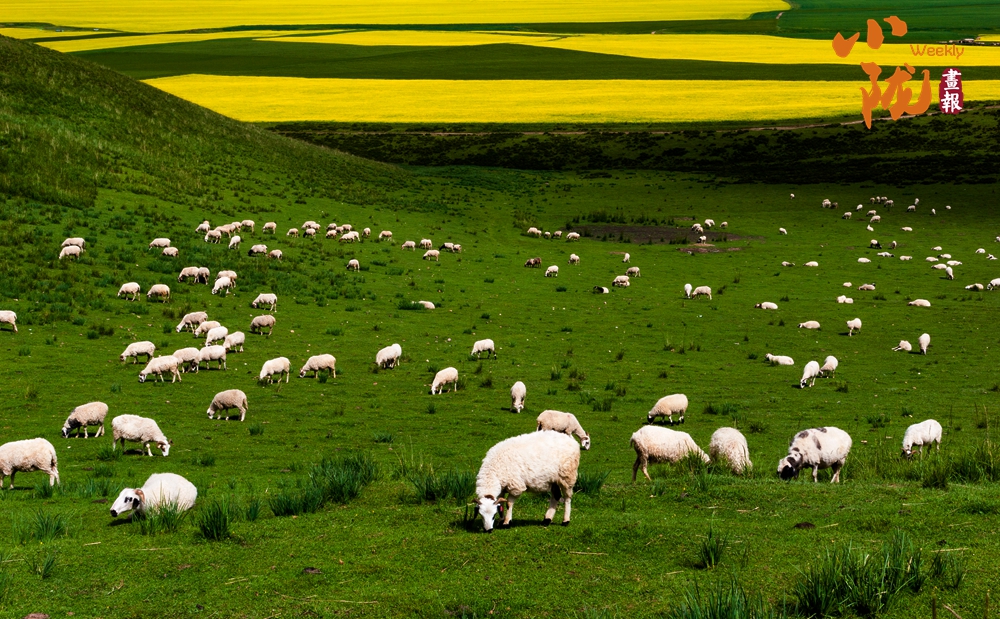 一眼望去,碧綠一片,風景秀美。羊群放牧于焉支山下的大草原上,金黃的油菜花、無邊的草原,氣勢壯觀。
