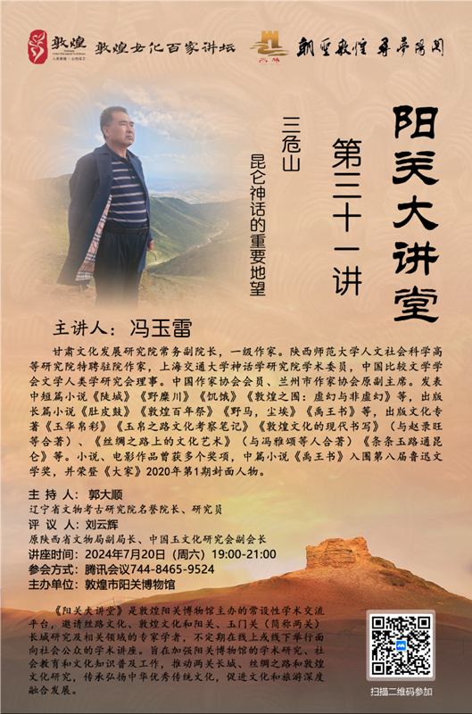 中國甘肅網(wǎng)7月18日訊 7月20日,西北師范大學(xué)甘肅文化發(fā)展研究院常務(wù)副院長、一級作家、玉文化學(xué)者馮玉雷將在線進(jìn)行題為《三危山:昆侖神話的重要地望》的講座。本次講座由敦煌陽關(guān)博物館主辦,為“敦煌文化百家講壇”第31講,遼寧省文物考古研究院名譽(yù)院長、資深考古學(xué)家、玉學(xué)家郭大順研究員擔(dān)綱主持,陜西省文物局原副局長、中國玉文化研究會(huì)副會(huì)長、資深玉學(xué)家劉云輝教授擔(dān)綱評議。