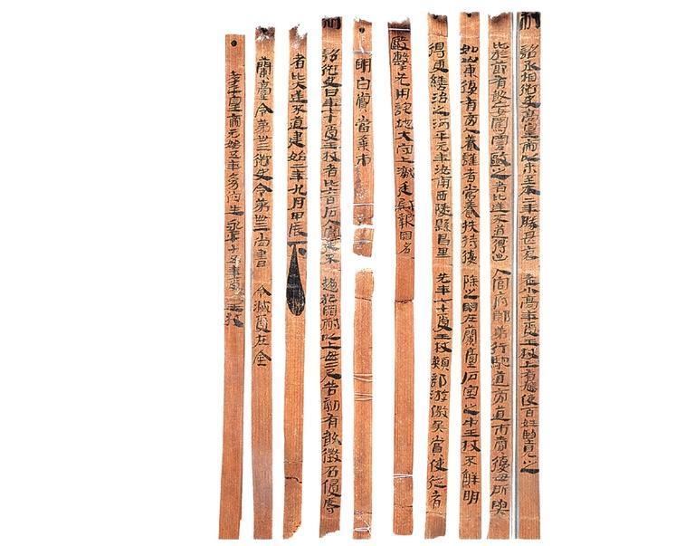 王杖簡,漢代,出土于武威市磨咀子漢墓。共計10枚,松木削制。兩道編繩,先書后編;墨書隸體,字跡清晰。每枚簡容字多者37字,少者6字,共240字。其內(nèi)容記載了東漢永平十五年(72年)幼伯受王杖事,并錄建始二年(前31年)九月“年七十受王杖”的詔書與河平元年(前28年)毆擊王杖主當(dāng)棄市的令。