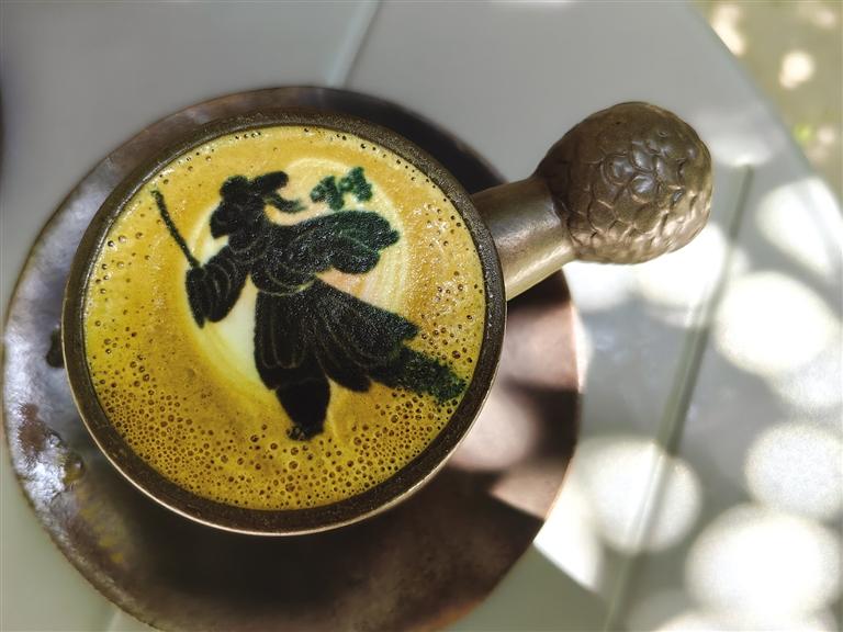 驚喜還有很多,就像店內(nèi)柜體上的一句話“可以讓大家體會(huì)到我們不一樣的用心”,這些年輕人用心起來還真能撬動(dòng)地球。飲品和咖啡,設(shè)計(jì)團(tuán)隊(duì)愣是把口味和地域文化結(jié)合起來,整出了幾款“限量版”:城市限定——沙橙暴飲品,西北特有;特調(diào)咖啡——苦水玫瑰特調(diào),讓人一口難忘之余還配上了臺(tái)詞,“苦水玫瑰有點(diǎn)甜”;“文物咖啡”更是占據(jù)“C位”,咖啡拉花機(jī)“印制”而成的微縮版銅奔馬、蛙紋罐、銅車馬等文物圖案浮在濃郁的咖啡上,精致、唯美。這還不算,咖啡器皿的名稱也非同尋常——鷹首權(quán)杖杯。陶瓷來自景德鎮(zhèn),手柄是省博鷹頭形青銅權(quán)杖首的文物原型。驚嘆、贊美、感慨,每一位品嘗之人喜愛之余竟不忍飲用。
