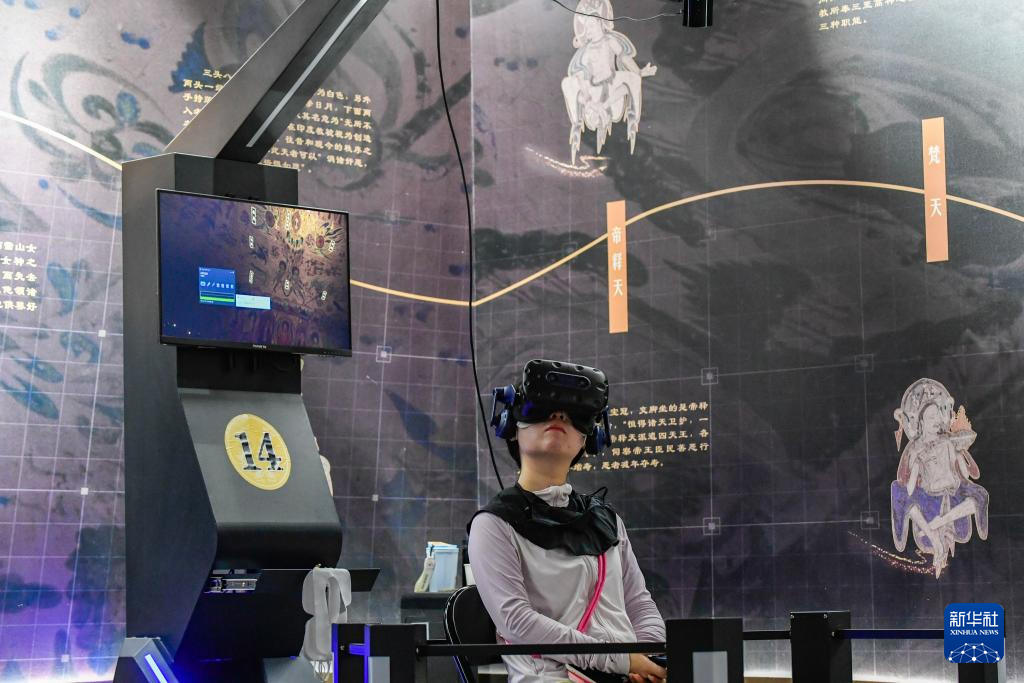 7月22日,游客借助VR設(shè)備沉浸式游覽莫高窟第285窟虛擬場景。新華社記者 郎兵兵 攝