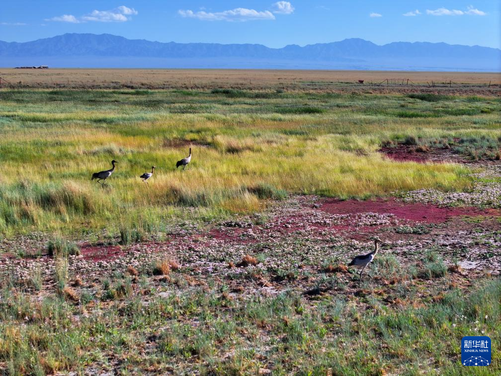 7月30日,黑頸鶴在小蘇干湖濕地覓食(無人機(jī)照片)。新華社發(fā)(高宏善 攝)