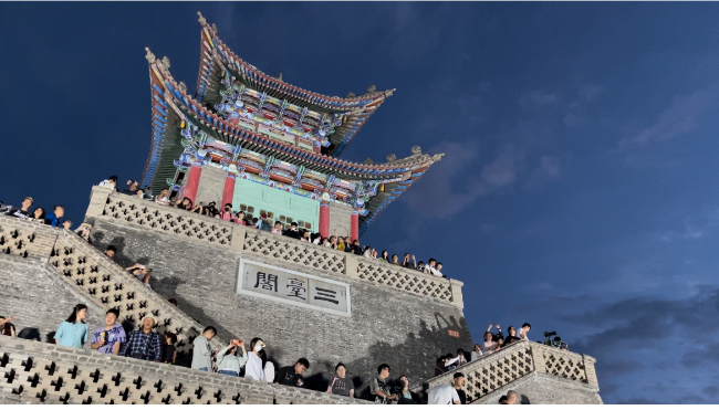 夕陽西下,夜色漸濃,三臺(tái)閣上游人如織,山下的萬家燈火隨著夕陽余暉的隱退漸漸蘇醒,一盞盞燈光次第亮起,璀璨如星海。人們紛紛舉起手機(jī)和相機(jī),記錄下這一刻的美好。“真不愧是金城蘭州,站在這里俯瞰蘭州是什么神仙視角!”“終于知道夜晚的蘭州為啥被稱作‘蘭哈頓’了,回去好好跟朋友炫炫……”來自陜西的大學(xué)生小劉和他的小伙伴們一邊尋找拍照最佳角度,忍不住發(fā)出贊嘆。在這一刻,古老的閣樓與游客一起沉醉在蘭山的夏夜晚風(fēng)中?!?/p>