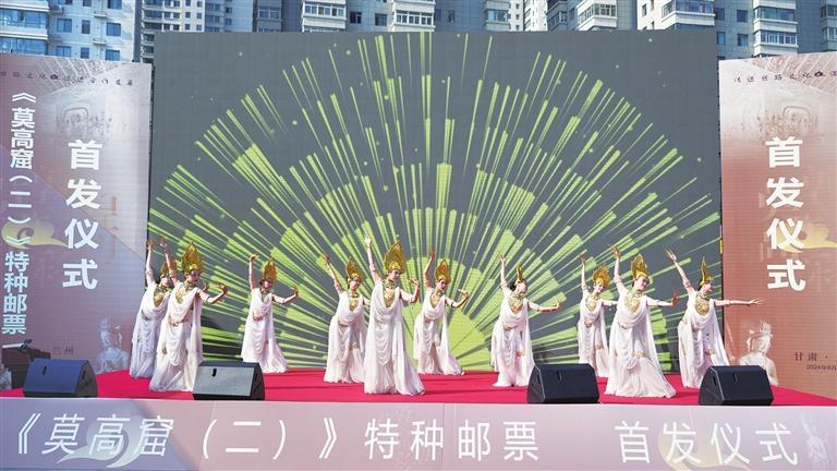 敦煌文化博大精深,敦煌舞蹈美輪美奐。首發(fā)儀式上,舞者身著飄逸的古裝,頭戴華麗的發(fā)飾,手持飄帶,仿佛從天而降的仙子。她們?cè)谝魳?lè)的伴奏下,翩翩起舞,輕盈如燕,婉約如風(fēng),一曲《千手觀音》拉開了《莫高窟(二)》特種郵票發(fā)行儀式的序幕。