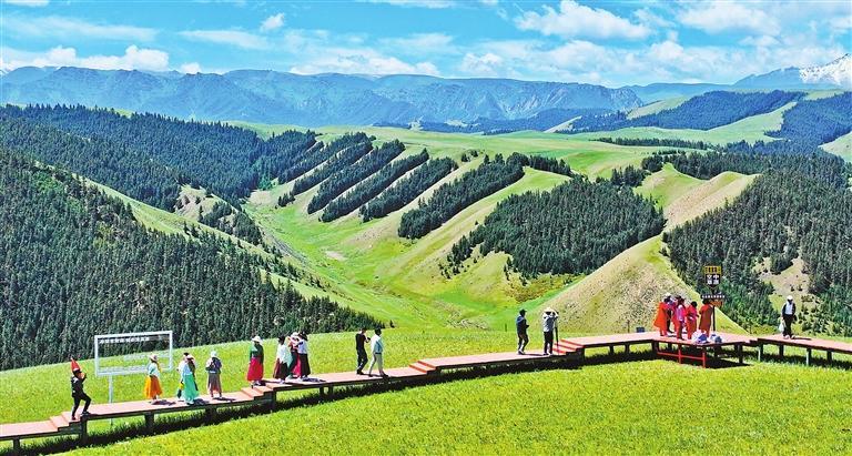 游客在肅南縣康樂(lè)草原領(lǐng)略祁連風(fēng)光。 新甘肅·甘肅日?qǐng)?bào)通訊員 王將
