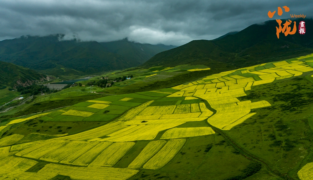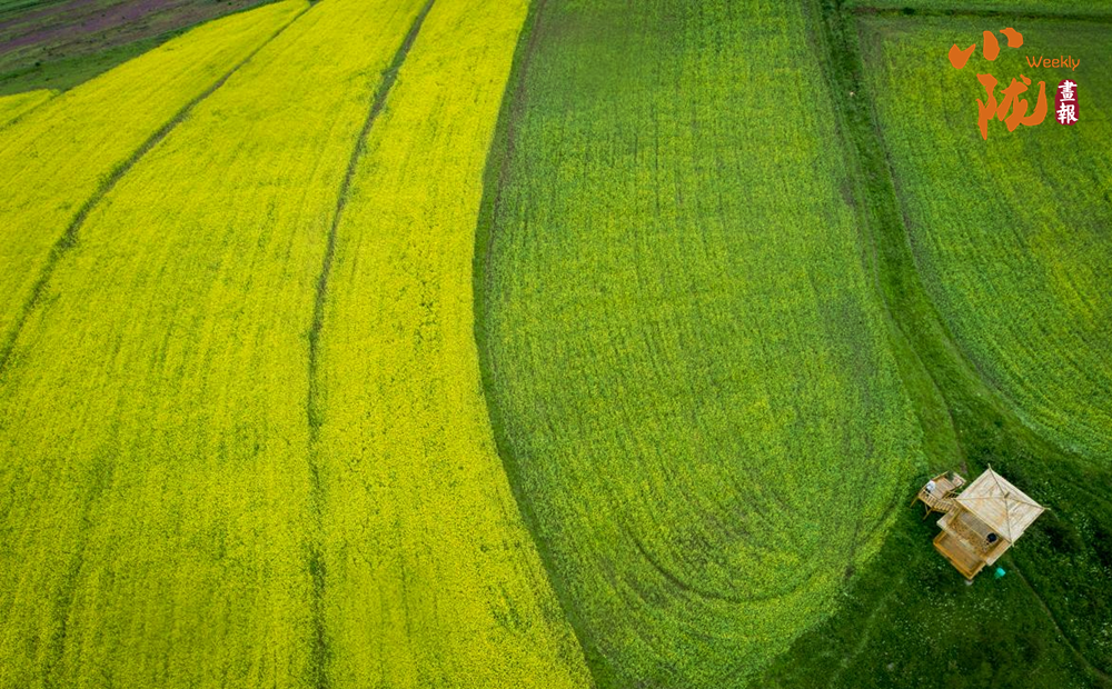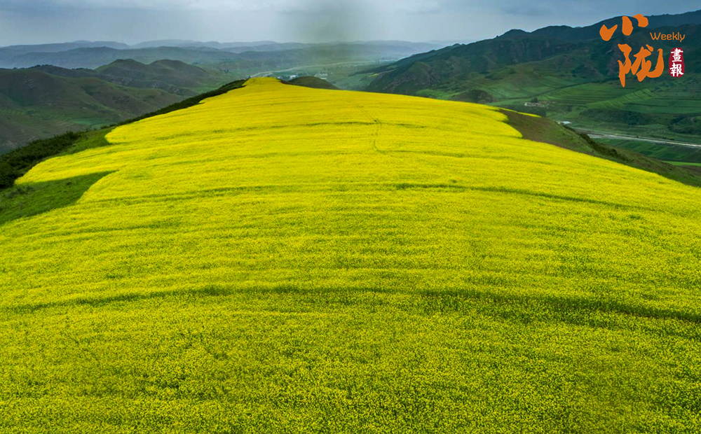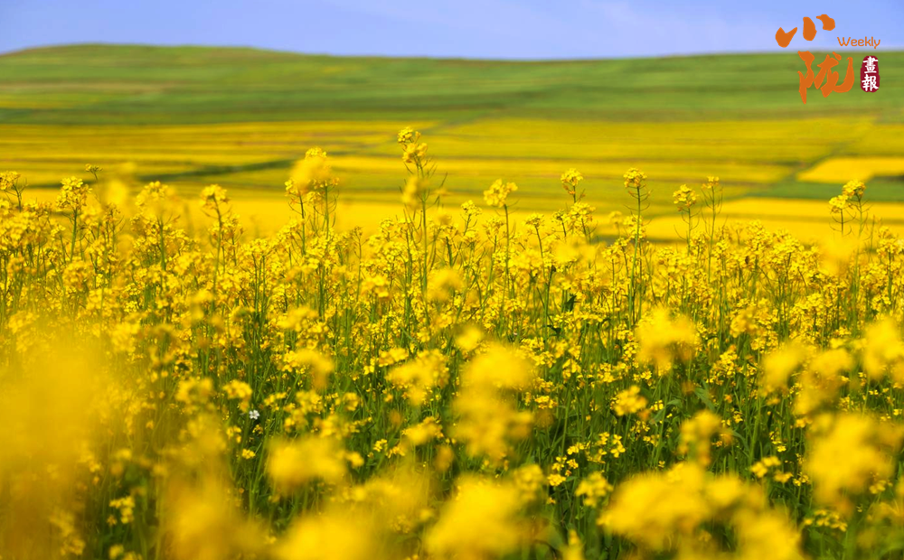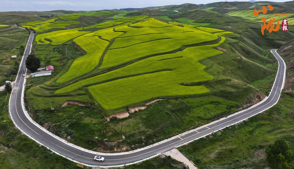 黃燦燦的油菜花鋪蓋在逶迤的山坡上,染盡山野,與此起彼伏的祁連山脈、古樸的民舍、一望無際的田野,共同繪就了一幅極具藝術感的“油畫”。
