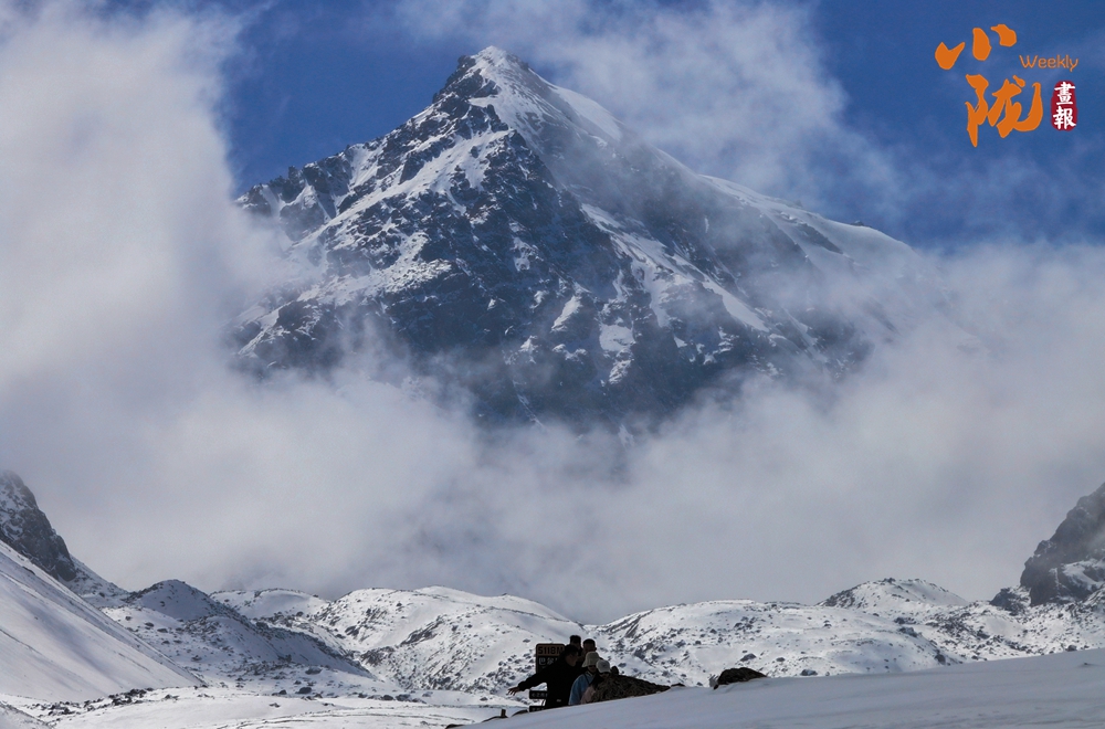 雪山山巒間,云霧回旋飄動,彌漫舒展,如海浪起伏、波濤滾滾一般,與湛藍天空相互映襯,壯美如畫。