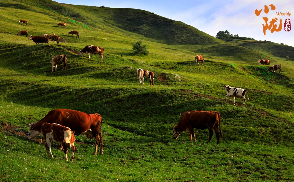 這里是少有的原生態(tài)草場。天空湛藍,白云朵朵,成群的牛羊悠閑地吃著草,初秋的風吹拂著它們的毛發(fā),輕柔而溫暖,仿佛給予它們生命的滋潤。
