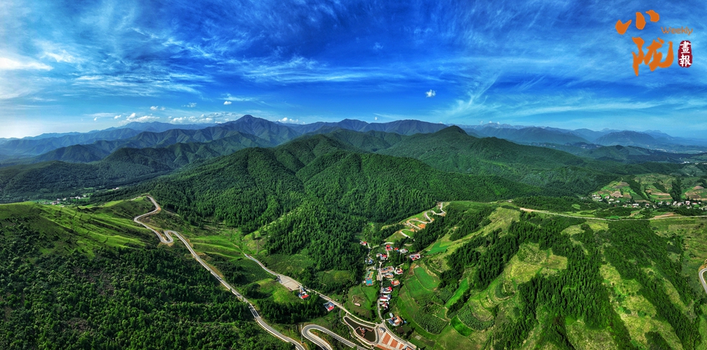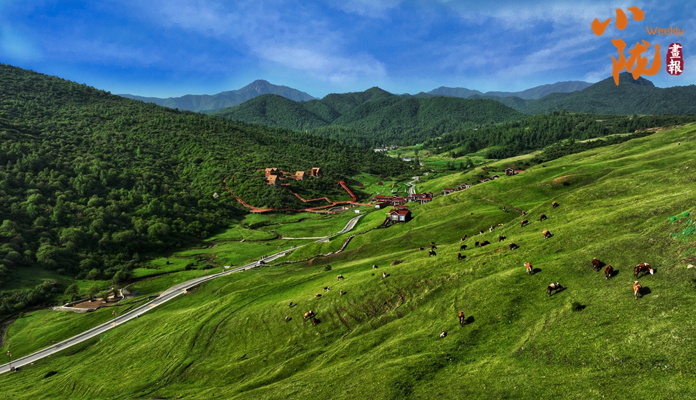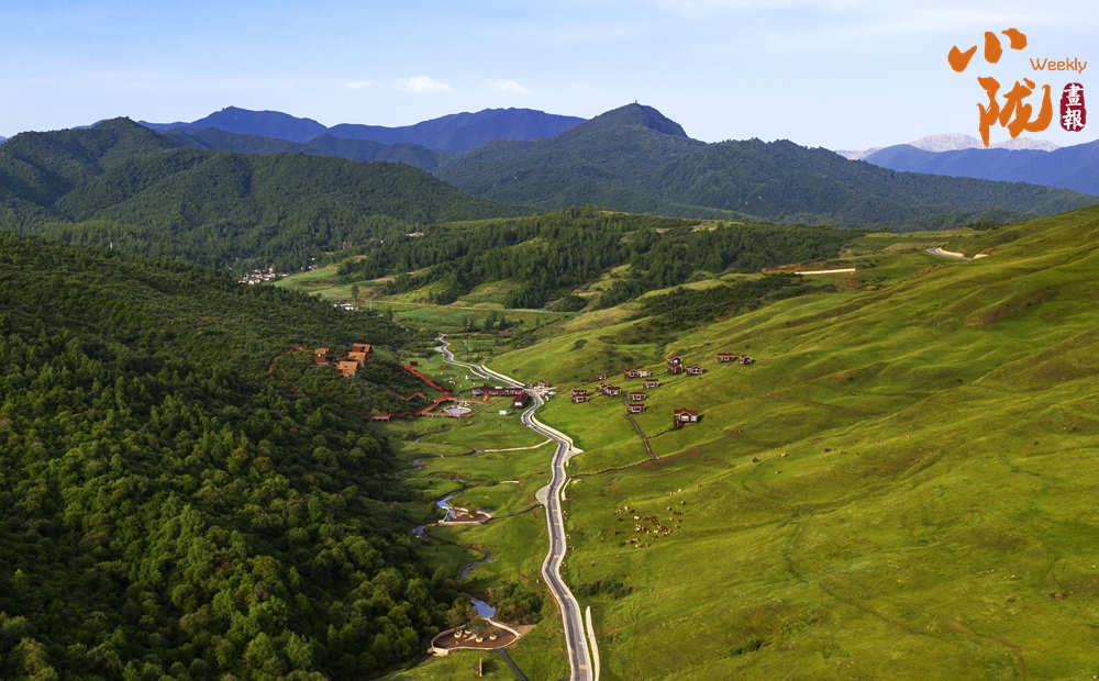 放眼望去,山峰起起伏伏,宛如鋪上了一層綠毯。山巒與草坡、森林及紅瓦白墻映入眼簾,景區(qū)道路伸向遠方。