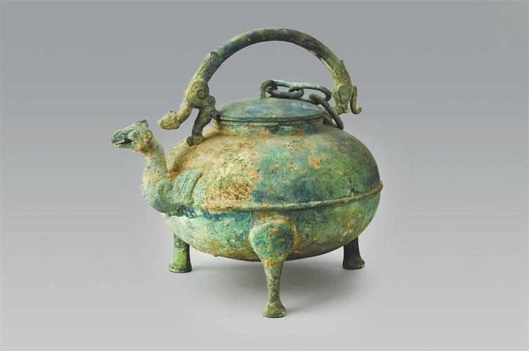 山西省長(zhǎng)治市分水嶺36號(hào)墓出土。扁橢圓體曲流形盉,口沿外侈,上為圓雕的振翅鳥形蓋,盉身兩側(cè)飾三周紋飾,上部飾體軀相交的龍紋。