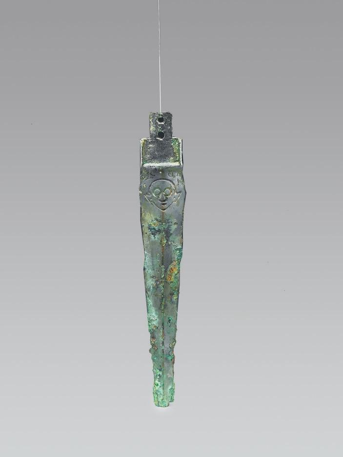 山西省絳縣橫水墓地出土。身呈長(zhǎng)條形,中部起脊,兩刃斜直,刃緣鋒利,劍身橫截面呈菱形。莖格部平面呈“凸”字形,有闌,側(cè)闌凸起,橫截面呈“工”字形,后端較窄,有兩個(gè)圓穿。劍身近莖格處兩面均飾陰線人面紋。雙合范鑄造。兩面人面紋頭頂上方鑄銘文:“楚公逆□□中戈。”考古人員推斷,有可能該件器物的作器者為楚公逆,與晉侯墓地M64出土的楚公逆編鐘、宋代嘉魚縣出土的楚公逆鐘的作器者為同一人。