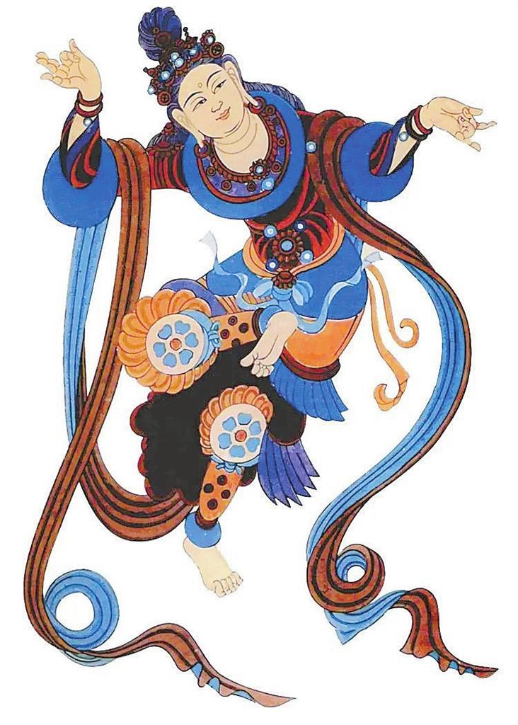 敦煌莫高窟,窟窟有壁畫(huà),拼接起來(lái)長(zhǎng)達(dá)45000多平方米,有世界上“最大畫(huà)廊”之稱(chēng)。這些壁畫(huà)中,幾乎每幅都有舞蹈形象,如在窟頂、龕楣、藻井遨游的飛天,憑欄上的天宮伎樂(lè),經(jīng)變畫(huà)中的娛佛、敬佛的獻(xiàn)舞者——伎樂(lè)天,出行圖中跳著具有濃郁生活氣息的世俗樂(lè)舞,以及富有舞蹈美感的彩塑菩薩、天王力士等,琳瑯滿目,精妙絕倫。這些舞蹈形象充分反映了從十六國(guó)北朝至元代千余年來(lái)不同歷史時(shí)期的舞蹈服飾、形態(tài)、風(fēng)貌,為我們挖掘、整理、弘揚(yáng)中華民族舞蹈文化提供了十分珍貴的形象資料。