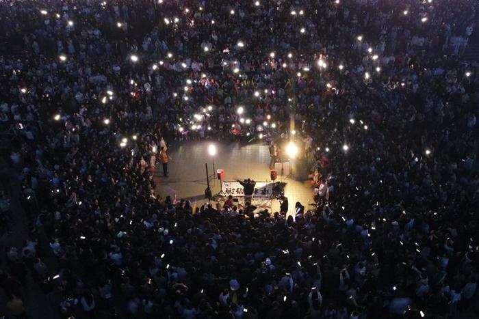 在蘭州市城關(guān)區(qū)的黃河蘭州段近水平臺,市民及游客參與“蘭州黃河大合唱”活動。新華社記者 范培珅 攝