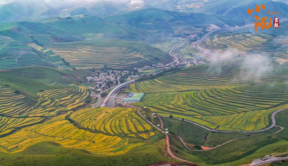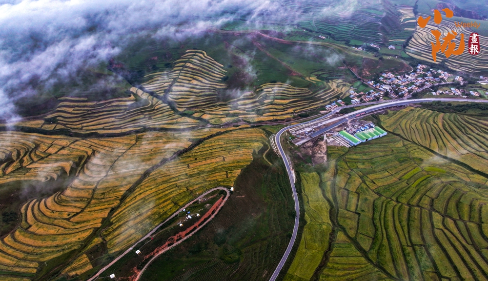 一場秋雨過后,甘南臨潭連綿的群山被云霧籠罩,星羅棋布的梯田上迎來收獲期,稻浪滾滾,美不勝收。