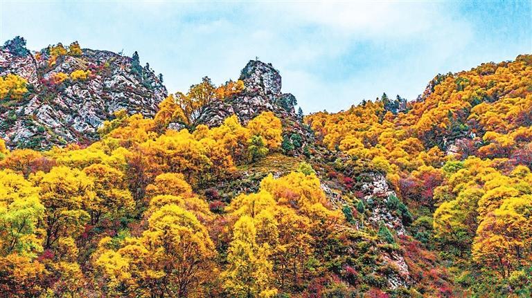 近處山坡人工栽植的落葉松和云杉云鬢輕挽、密密匝匝,白楊林青翠欲滴、亭亭玉立,遠(yuǎn)處異峰林立、斷崖高聳,與藍(lán)天相接,與白云比高,讓人不覺間心馳神往。