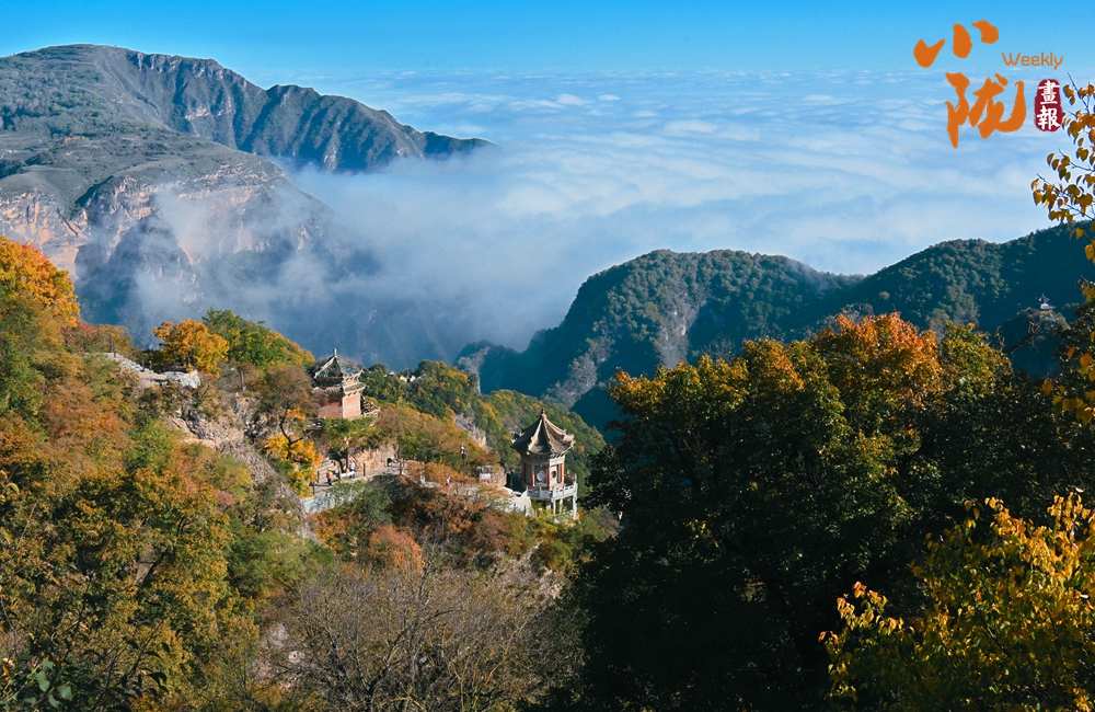 云霧繚繞,金黃的葉子似金色海洋,覆蓋山脈,在陽光照耀下散發(fā)著溫暖光芒,仿佛為崆峒山披上了璀璨外衣。