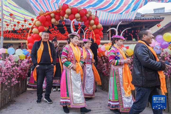 2022年1月13日,在隴南市文縣鐵樓藏族鄉(xiāng)寨科橋村,婚禮宴席結(jié)束后賓客到村寨中走親訪(fǎng)友。新華社記者 郎兵兵 攝