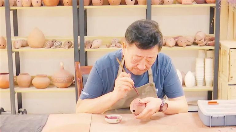 傳承人關(guān)振國(guó)在完成玉門陶塤的彩繪環(huán)節(jié)。