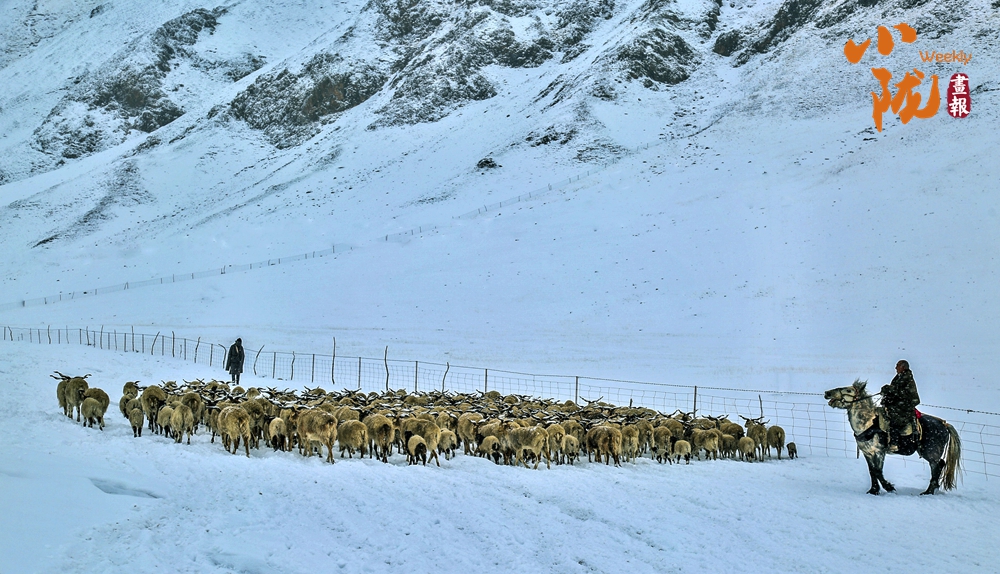 天地一色,萬(wàn)物寂靜,風(fēng)雪牧歸。牧民在雪地里放牧牛羊,人和羊在白雪覆蓋的草原上共同演繹著生活的樂(lè)章。