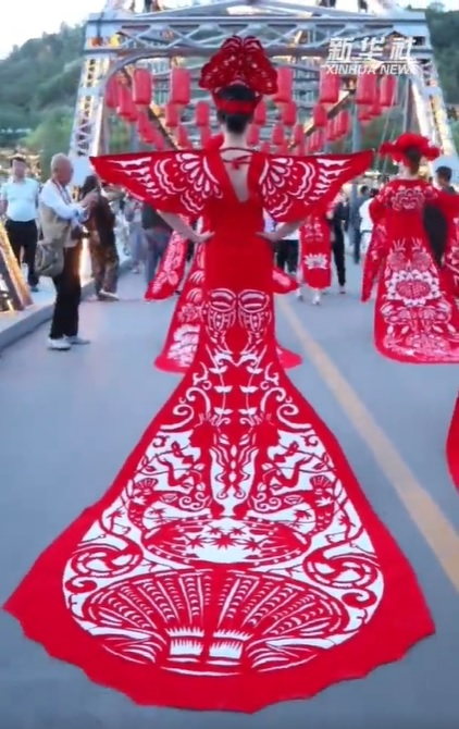 慶陽(yáng)剪紙?jiān)从谏?、講究情趣,是勞動(dòng)人民生產(chǎn)生活、情感氣質(zhì)、觀念習(xí)俗和文化傳承的結(jié)晶。著名民俗學(xué)家靳之林先生稱剪紙藝人是“真正的藝術(shù)家”。1986年,中央美術(shù)學(xué)院邀請(qǐng)鎮(zhèn)原縣民間美術(shù)大師祁秀梅赴北京進(jìn)行民間美術(shù)教學(xué)交流,向大學(xué)生演示民間剪紙。法國(guó)、日本、澳大利亞等國(guó)家的藝術(shù)家也多次專程到隴東考察民間剪紙藝術(shù)。慶陽(yáng)剪紙已由鄉(xiāng)村婦女手中的小玩意,堂而皇之地步入了國(guó)家藝術(shù)殿堂——中國(guó)民間美術(shù)館,并在日、意、澳等國(guó)家展覽亮相。圖為身著慶陽(yáng)剪紙服裝的模特們行走在蘭州中山橋上,驚艷了來(lái)往的游客。