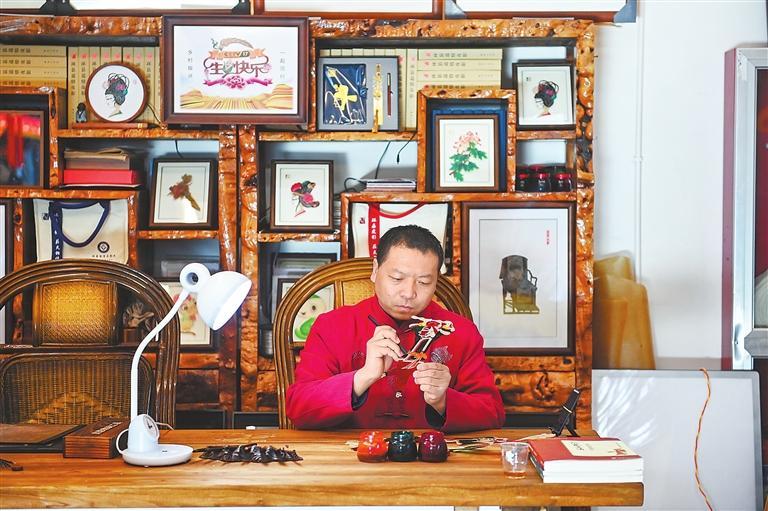 張治文以刀為筆,精心制作皮影。