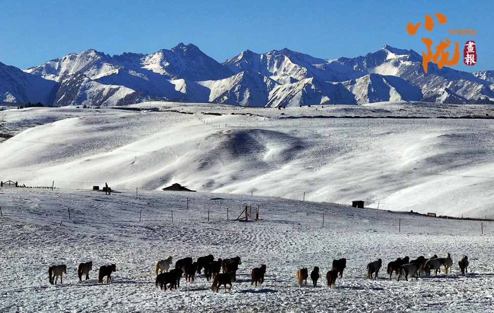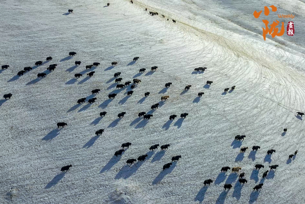 牛群在雪地中悠閑地覓食,和雪景相映成趣,給這片寧?kù)o的草原帶來了生機(jī)與活力。