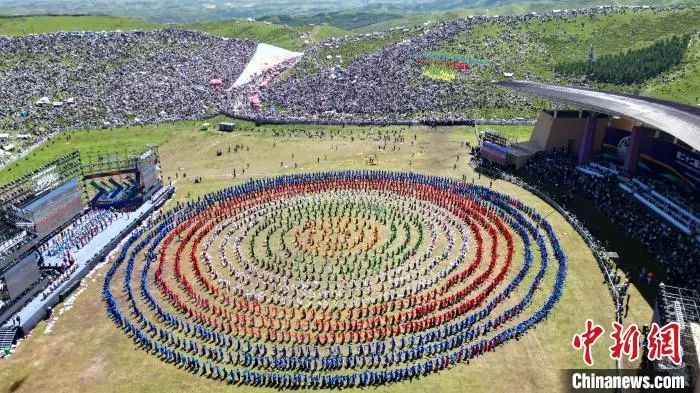 2024年8月4日,第22屆九色甘南香巴拉旅游藝術節(jié)在甘肅省甘南藏族自治州當周草原開幕。圖為開幕式現(xiàn)場鍋莊舞表演。(資料圖)九美旦增 攝