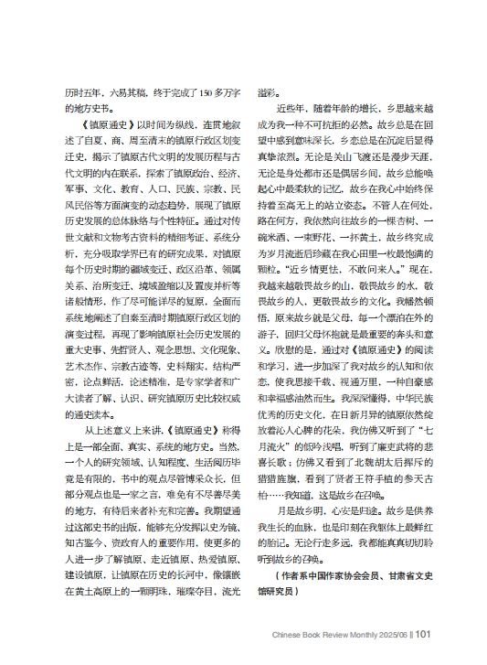 從上述意義上來講,《鎮(zhèn)原通史》稱得上是一部全面、真實、系統(tǒng)的地方史。當(dāng)然,一個人的研究領(lǐng)域、認(rèn)知程度、生活閱歷畢竟是有限的,書中的觀點盡管博采眾長,但部分觀點也是一家之言,難免有不盡善盡美的地方,有待后來者補(bǔ)充和完善。我期望通過這部史書的出版,能夠充分發(fā)揮以史為鏡、知古鑒今、資政育人的重要作用,使更多的人進(jìn)一步了解鎮(zhèn)原、走近鎮(zhèn)原、熱愛鎮(zhèn)原、建設(shè)鎮(zhèn)原,讓鎮(zhèn)原在歷史的長河中,像鑲嵌在黃土高原上的一顆明珠,璀璨奪目,流光溢彩。