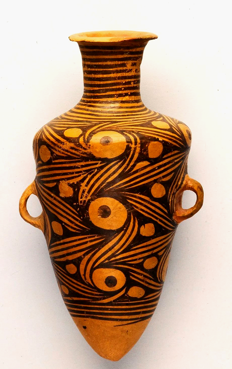 馬家窯文化馬家窯類型(距今4800年前)隴西縣呂家坪出土高26.8厘米,口徑7.1厘米。施黑彩,頸部繪平行條紋,肩、腹部繪四方連續(xù)漩渦紋。