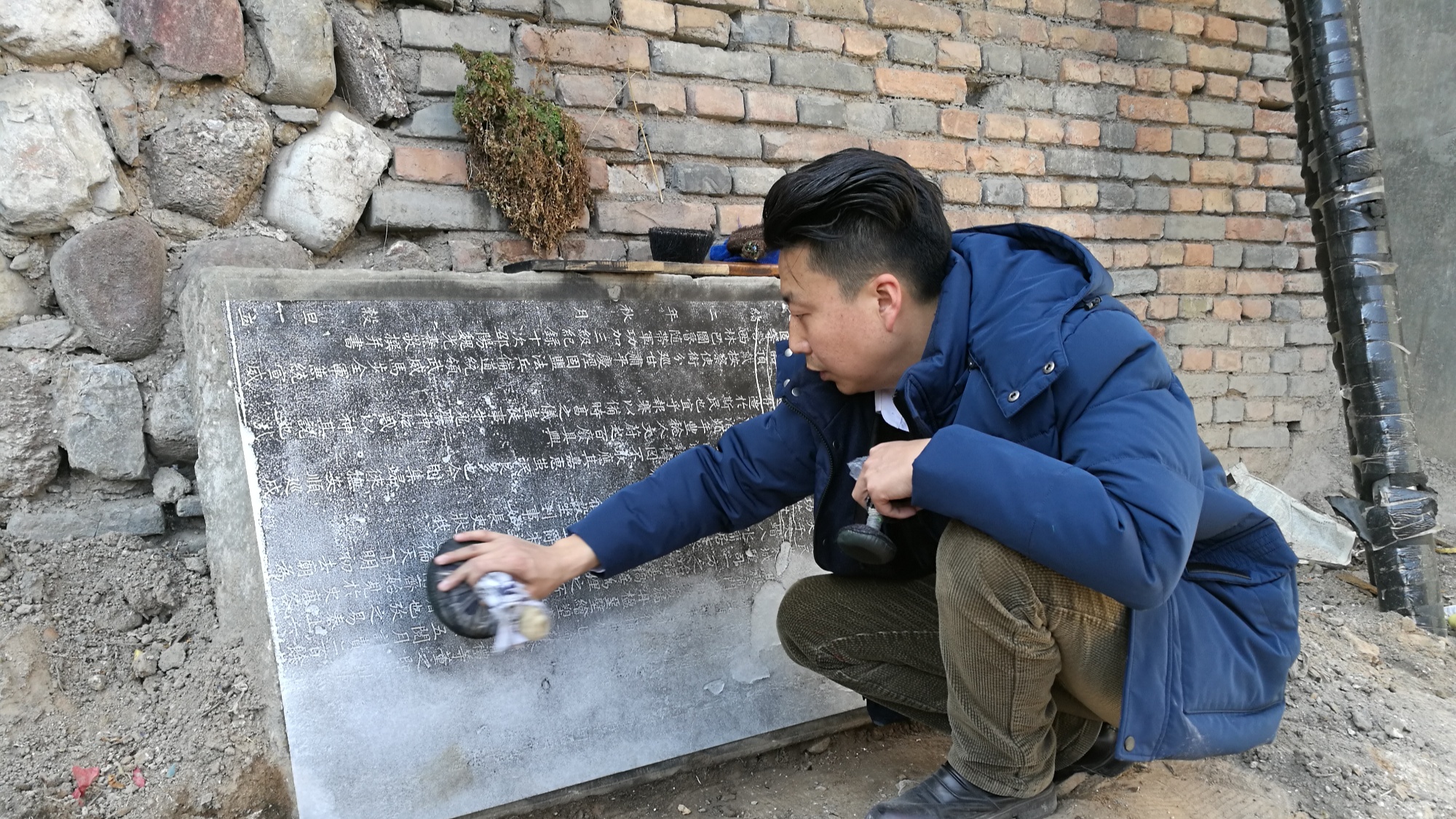 圖為張欽仲發(fā)現(xiàn)《重修平?jīng)龀勤驈R碑記》并制作拓片(崆峒區(qū)融媒體中心供圖)