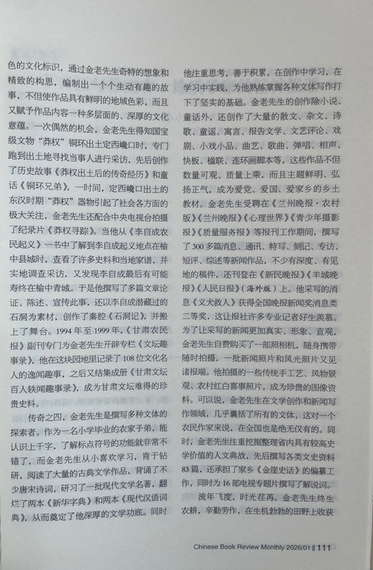 傳奇之四,金老先生是撰寫(xiě)多種文體的探索者。作為一名小學(xué)畢業(yè)的農(nóng)家子弟,能認(rèn)識(shí)上千字,了解標(biāo)點(diǎn)符號(hào)的功能就非常不錯(cuò)了,而金老先生從小喜歡學(xué)習(xí),肯于鉆研,閱讀了大量的古典文學(xué)作品,背誦了不少唐宋詩(shī)詞,研習(xí)了一批現(xiàn)代文學(xué)名著,翻爛了兩本《新華字典》和兩本《現(xiàn)代漢語(yǔ)詞典》,從而奠定了他深厚的文學(xué)功底。同時(shí)他注重思考,善于積累,在創(chuàng)作中學(xué)習(xí),在學(xué)習(xí)中實(shí)踐,為他熟練掌握各種文體寫(xiě)作打下了堅(jiān)實(shí)的基礎(chǔ)。金老先生的創(chuàng)作除小說(shuō)、童話外,還創(chuàng)作了大量的散文、雜文、詩(shī)歌、童謠、寓言、報(bào)告文學(xué)、文藝評(píng)論、戲劇、小戲小品、曲藝、歌曲、彈唱、相聲、快板、楹聯(lián)、連環(huán)畫(huà)腳本等,這些作品不但數(shù)量可觀、質(zhì)量上乘,而且主題鮮明、弘揚(yáng)正氣,成為愛(ài)黨、愛(ài)國(guó)、愛(ài)家鄉(xiāng)的鄉(xiāng)土教材。金老先生受聘在《蘭州晚報(bào)·農(nóng)村版》《蘭州晚報(bào)》《心理世界》《青少年攝影報(bào)》《質(zhì)量服務(wù)報(bào)》等報(bào)刊工作期間,撰寫(xiě)了300多篇消息、通訊、特寫(xiě)、側(cè)記、專(zhuān)訪、短評(píng)、綜述等新聞作品,不少有深度、有見(jiàn)地的稿件,還刊登在《新民晚報(bào)》《羊城晚報(bào)》《人民日?qǐng)?bào)》(海外版)上。他采寫(xiě)的消息《義犬救人》獲得全國(guó)晚報(bào)新聞獎(jiǎng)消息類(lèi)二等獎(jiǎng),這讓報(bào)社許多專(zhuān)業(yè)記者好生羨慕。為了讓采寫(xiě)的新聞更加真實(shí)、形象、直觀,金老先生自費(fèi)購(gòu)買(mǎi)了一部照相機(jī),隨身攜帶隨時(shí)拍攝,一批新聞?wù)掌惋L(fēng)光照片又見(jiàn)諸報(bào)端。他拍攝的一些傳統(tǒng)手工藝、風(fēng)物景觀、農(nóng)村紅白喜事照片,成為珍貴的圖像資料??梢哉f(shuō),金老先生在文學(xué)創(chuàng)作和新聞寫(xiě)作領(lǐng)域,幾乎囊括了所有的文體,這對(duì)一個(gè)農(nóng)民作家來(lái)說(shuō),在全國(guó)也是絕無(wú)僅有的。同時(shí),金老先生注重挖掘整理省內(nèi)具有較高史學(xué)價(jià)值的人文典故,先后撰寫(xiě)各類(lèi)文史資料83篇,還承擔(dān)了家鄉(xiāng)《金崖史話》的編纂工作,同時(shí)為16部電視專(zhuān)題片撰寫(xiě)了解說(shuō)詞。
