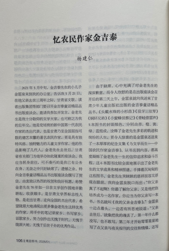 由于缺席,心中充滿(mǎn)了對(duì)金老先生的深深歉意。而令人欣慰的是在出版座談會(huì)召開(kāi)后的第二天上午,金雷泉就向我送來(lái)了甘肅少年兒童出版社出版的金吉泰童話精品叢書(shū),《頭戴水珠的小杉苗》《沒(méi)牙三弦琴》《銅環(huán)兄弟》《小蜜蜂偵察記》《青蛙借雷聲》5本圖書(shū)的封面顏色,分別由赤、橙、黃、綠、藍(lán)組成,詮釋了金老先生多彩的軌跡和繽紛的人生。更令人驚喜的是金雷泉還送來(lái)了一本厚厚的紀(jì)念文集《為文學(xué)而生——中國(guó)農(nóng)民作家金吉泰》,從書(shū)名到內(nèi)容,都高度凝練了金老先生一生的信仰追求和奮斗歷程,這6本圖書(shū)比較全面地展示出了金老先生的文學(xué)成果和精神圖譜。手捧著沉甸甸的這些圖書(shū),金老先生笑瞇瞇的慈祥面容又浮現(xiàn)在眼前,我向金雷泉脫口而出:“你父親真了不起?。∧阕盍私饽愀赣H,又是他把你培養(yǎng)成為一名作家,你應(yīng)當(dāng)為你父親寫(xiě)一本書(shū),書(shū)名就叫《我的父親金吉泰》。”金雷泉一邊點(diǎn)著頭,一邊若有所思地說(shuō)道:“父親去世后,就像把我的魂丟了,第一年什么都沒(méi)寫(xiě),也不敢寫(xiě),第二年才開(kāi)始零零星星地寫(xiě)了點(diǎn)父親與有關(guān)報(bào)刊的交往和情緣,還寫(xiě)了點(diǎn)父親在生活和寫(xiě)作中的軼事趣聞。您的建議非常好,我擔(dān)心駕馭不好,試試看吧。”我感覺(jué)金雷泉有點(diǎn)為難,馬上又安慰他:“不急,你用兩三年時(shí)間慢慢寫(xiě)。”