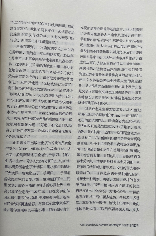 由敦煌文藝出版社出版的《我的父親金吉泰》,有108個(gè)趣味橫生的故事組成,多角度、多側(cè)面講述了金老先生學(xué)習(xí)、創(chuàng)作、生活、生產(chǎn)、為人處世等方面的生動(dòng)細(xì)節(jié),用小視角折射出了大情懷,用小切口彰顯出了大境界,成功塑造了一手耕田、一手握筆的農(nóng)民作家的典型形象,生動(dòng)刻畫(huà)了一生沉醉文學(xué)、癡心不改的堅(jiān)守者的心靈世界,忠實(shí)記錄了金老先生70年如一日在文學(xué)創(chuàng)作園地精心耕耘的快樂(lè)時(shí)光和輝煌歷程。這本回憶錄故事講述精彩,盡管每個(gè)故事文字不長(zhǎng),看似生活中的平常小事,但仔細(xì)閱讀才發(fā)現(xiàn)都是精心篩選的經(jīng)典故事,讓人們看到了金老先生漫長(zhǎng)人生途中最出彩、最可貴、最有趣的幸福時(shí)刻和生活場(chǎng)景。細(xì)節(jié)描述生動(dòng),故事中許多細(xì)節(jié)新鮮活潑、栩栩如生,將人們情不自禁地帶入到現(xiàn)實(shí)場(chǎng)面中,讀起來(lái)耐人尋味、引人入勝。情感真摯飽滿(mǎn),敘述的故事幾乎都用白描的手法,親切自然,真實(shí)可信,讓讀者在深情厚誼中深刻感悟到金老先生高貴的靈魂和高尚的品格??梢哉f(shuō),這本書(shū)是金老先生精彩人生的高度縮影,是人品和文品相映生輝的集中展示,也是父子作家堅(jiān)守文學(xué)理想的深情告白,讀來(lái)韻味悠長(zhǎng),感同身受,仿佛金老先生又笑瞇瞇地來(lái)到了我們身旁。
