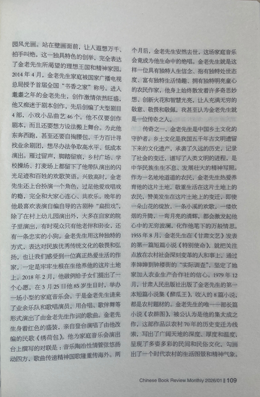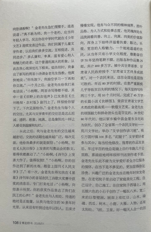 從此之后,我與金老先生的交往越來(lái)越密切,交流的話題也越來(lái)越廣泛,每次見(jiàn)面,他給我最多的就是鼓勵(lì):“小楊啊,你在《人民日?qǐng)?bào)》上發(fā)表的寫(xiě)奧運(yùn)會(huì)的散文,看得我都激動(dòng)了。”“小楊啊,《詩(shī)刊》上發(fā)表大作了,值得祝賀!”“小楊啊,你的創(chuàng)作達(dá)到了新的水準(zhǔn),都登上國(guó)刊《人民文學(xué)》了。”有一次,金老先生得知我在《星星》詩(shī)刊舉辦的首屆農(nóng)民工詩(shī)歌大獎(jiǎng)賽中獲獎(jiǎng)的消息后,專(zhuān)門(mén)打來(lái)電話:“小楊啊,向你表示祝賀,你的獲獎(jiǎng)作品表達(dá)了我們農(nóng)民工的心聲!”金老先生與人相處,傳遞的絕對(duì)是正能量,從我與他交往的30多年時(shí)光里,從來(lái)沒(méi)有聽(tīng)到過(guò)他非議別人。后來(lái)才慢慢發(fā)現(xiàn),他有與眾不同的精神境界、質(zhì)樸品格、為人方式和處事態(tài)度,他靈魂深處永遠(yuǎn)流淌著向善、向上、向真、向美的價(jià)值取向,渾身上下始終洋溢著執(zhí)著、豁達(dá)、樂(lè)觀、寬容的人格魅力。一個(gè)地地道道的農(nóng)民,從當(dāng)年只有小學(xué)文化程度,靠勤奮自學(xué)70年堅(jiān)持筆耕不輟,出版各種作品集25部,共計(jì)400多萬(wàn)字,被中共甘肅省委、甘肅省人民政府授予“甘肅省文藝終身成就獎(jiǎng)”。對(duì)一個(gè)農(nóng)民來(lái)說(shuō),這在全國(guó)也是屈指可數(shù)的。年近80歲的時(shí)候,在患嚴(yán)重眼疾幾乎導(dǎo)致雙目失明的情況下,每天堅(jiān)持寫(xiě)作兩三千字,用10個(gè)月時(shí)間,完成了45萬(wàn)字的長(zhǎng)篇小說(shuō)《農(nóng)耕圖》,榮獲甘肅省文學(xué)藝術(shù)類(lèi)政府最高獎(jiǎng)——敦煌文藝獎(jiǎng),金老先生的頑強(qiáng)毅力和拼命勁頭也是罕見(jiàn)的。20世紀(jì)80年代初,他以家鄉(xiāng)榆中縣金崖鄉(xiāng)文化站為依托,創(chuàng)辦了全省第一個(gè)農(nóng)民文學(xué)社——苑川文學(xué)社,舉辦“文學(xué)創(chuàng)作講習(xí)班”,吸引方圓村鎮(zhèn)100多名“泥腿子”文學(xué)愛(ài)好者參與其中,每當(dāng)經(jīng)他修改、推薦的作品發(fā)表后,年過(guò)半百的他總是騎上自行車(chē)跑幾十公里路,喜滋滋地將樣報(bào)樣刊送到作者手里,金老先生樂(lè)此不疲為文學(xué)愛(ài)好者全方位服務(wù)的情懷,在當(dāng)下是不多見(jiàn)的,更加顯得彌足珍貴。興趣廣泛的金老先生在晚年時(shí)突發(fā)奇想,在老宅院子里啟動(dòng)了家庭美化工程,自己設(shè)計(jì)、自己施工,在自家院子西墻上,用五顏六色的小石子創(chuàng)作了一幅長(zhǎng)八米、寬二米的巨型壁畫(huà),畫(huà)面上有紅日、山水、碌碡、西瓜、樹(shù)木、小鹿、大雁、人物,還有太陽(yáng)灶、飛機(jī)、衛(wèi)星,好一幅天人合一的田園風(fēng)光畫(huà)。站在壁畫(huà)面前,讓人遐想萬(wàn)千、拍手叫絕,這一獨(dú)具特色的創(chuàng)舉,完全表達(dá)了金老先生所渴望的理想王國(guó)和精神家園。2014年4月,金老先生家庭被國(guó)家廣播電視總局授予首屆全國(guó)“書(shū)香之家”稱(chēng)號(hào)。進(jìn)入耄耋之年的金老先生,創(chuàng)作激情依然旺盛,他又癡迷于劇本創(chuàng)作,先后創(chuàng)編了大型劇目4部,小戲小品曲藝46個(gè)。他不僅要?jiǎng)?chuàng)作劇本,而且還要想方設(shè)法搬上舞臺(tái)。為此他東奔西跑,甚至還要自掏腰包,千方百計(jì)尋找業(yè)余劇團(tuán),想盡辦法爭(zhēng)取高水平、低成本演出。雁過(guò)留聲,腳踏留痕,鄉(xiāng)村廣場(chǎng)、學(xué)校操場(chǎng)、打麥場(chǎng)上都留下了他帶隊(duì)演出的閃光足跡和百姓的歡歌笑語(yǔ)。興致高時(shí),金老先生還上臺(tái)扮演一個(gè)角色,過(guò)足他愛(ài)戲唱戲的癮,完全和大家心連心、共歡樂(lè)。晚年的他最喜歡表演自編自導(dǎo)的古劇種“扁擔(dān)戲”,除了在村上幼兒園演出外,大多在自家的院子里演出,有時(shí)觀眾只有他老伴和孫女,還有一條忠實(shí)的小狗。金老先生用這種獨(dú)特的方式,表達(dá)對(duì)民族優(yōu)秀傳統(tǒng)文化的敬畏和弘揚(yáng),也讓我們感受到一位真正熱愛(ài)生活的作家,一定是牢牢生根在生他養(yǎng)他的這片土地上。2018年2月,他破例給子女們提出了一個(gè)心愿,在3月25日他85歲生日時(shí),舉辦一場(chǎng)小型的家庭音樂(lè)會(huì)。于是金老先生請(qǐng)來(lái)了業(yè)余樂(lè)隊(duì)和歌唱演員,用合唱、歌伴舞等形式演出了由金老先生作詞的歌曲。金老先生身著紅色的盛裝,親自登臺(tái)演唱了由他改編的民歌《繡荷包》。他為家庭音樂(lè)會(huì)演出臺(tái)上撰寫(xiě)的對(duì)聯(lián)是:音樂(lè)陶冶性情管弦悠揚(yáng)動(dòng)四方,歌曲傳遞精神國(guó)歌隆重傳海外。兩個(gè)月后,金老先生安然去世,這場(chǎng)家庭音樂(lè)會(huì)竟成為他生命中的絕唱。金老先生就是這樣一位具有獨(dú)特人生信念、抱有獨(dú)特處世態(tài)度、富有獨(dú)特生活情趣、擁有獨(dú)特明亮童心的農(nóng)民作家,他身上始終散發(fā)著許多奇思妙想、創(chuàng)新火花和智慧光亮,讓人充滿(mǎn)無(wú)窮的敬意、敬畏和敬佩,我甚至認(rèn)為金老先生就是一位傳奇之人。