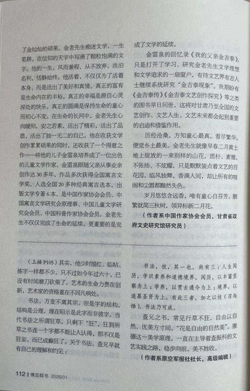 金雷泉的回憶錄《我的父親金吉泰》,只是打開(kāi)了學(xué)習(xí)、研究金老先生文學(xué)理想和文學(xué)追求的一扇窗戶(hù),有待文藝界有志人士繼續(xù)系統(tǒng)研究“金吉泰現(xiàn)象”。我期盼有《金吉泰傳》《金吉泰文藝創(chuàng)作探究》等之類(lèi)的圖書(shū)早日問(wèn)世,這將對(duì)甘肅乃至全國(guó)的文藝創(chuàng)作、文藝人生、文藝未來(lái)都會(huì)起到重要的啟迪和借鑒作用。