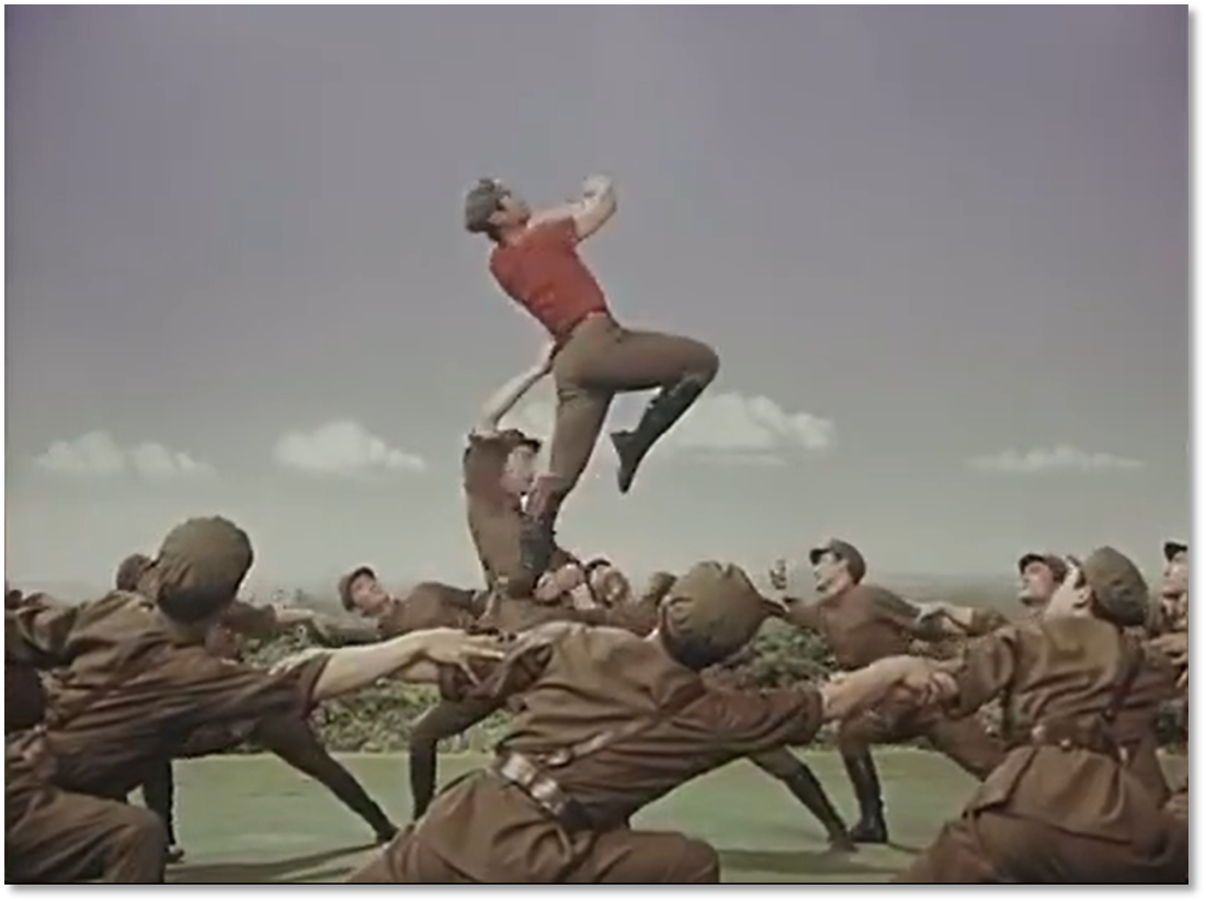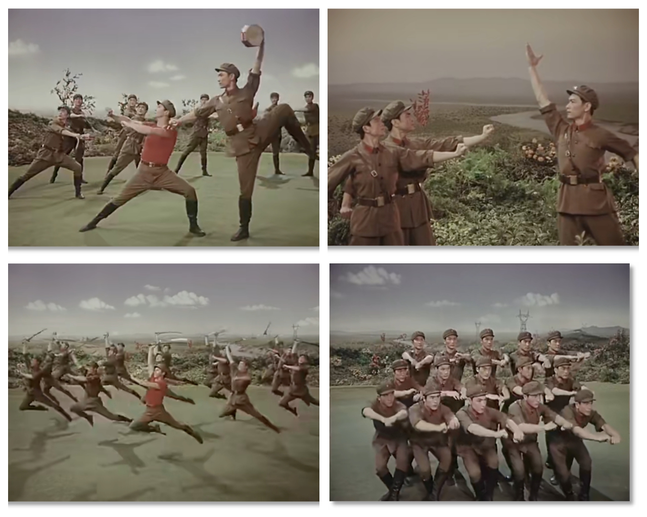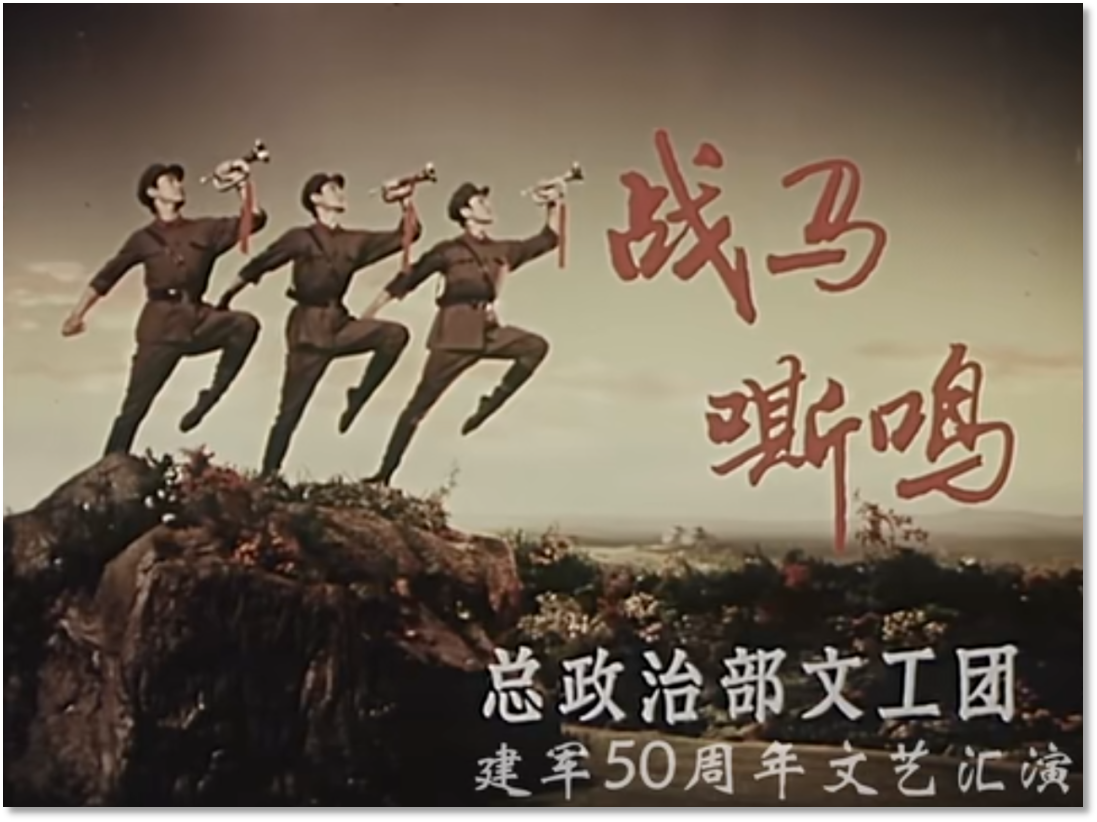 有趣的是,膠片并非被動(dòng)記錄,它悄然行使著選擇的權(quán)力——它決定了后世的人們將以何種視角、何種景別來銘記《戰(zhàn)馬嘶鳴》。在鏡頭中定格下來的膠片拷貝,就此定義了經(jīng)典的面貌。從舞臺到膠片,作品完成了一次關(guān)鍵的媒介化轉(zhuǎn)身,從一場限時(shí)演出,變身為一個(gè)時(shí)代的文化符號。這使軍藝精神在沒有數(shù)字媒體的時(shí)代,得以廣泛流傳和保存。