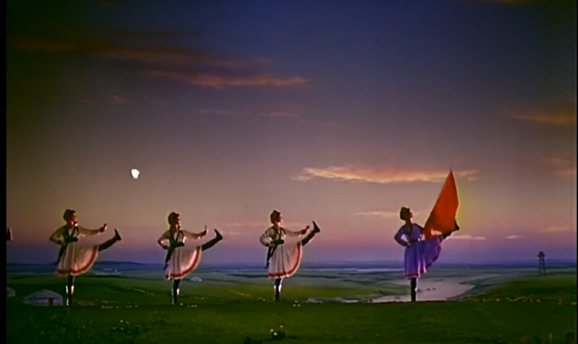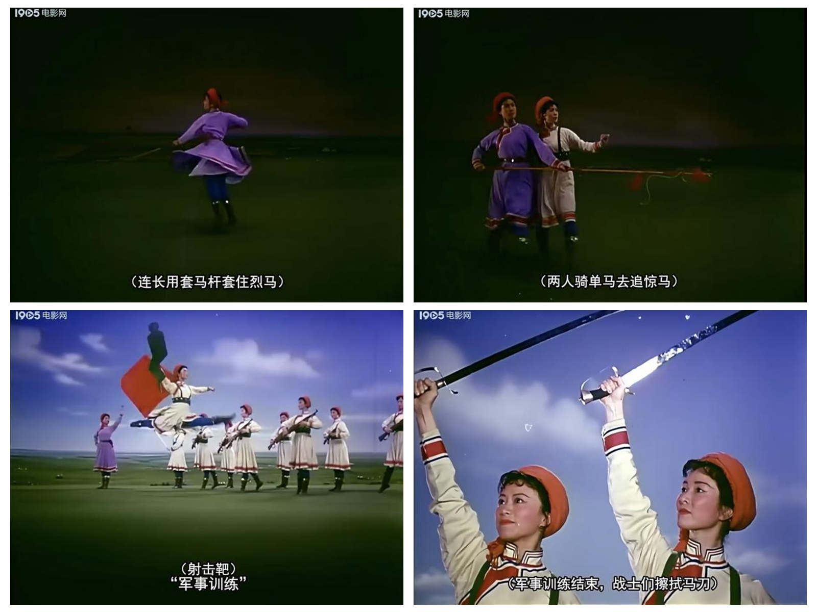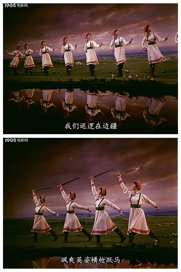 《草原女民兵》最初作為舞臺舞蹈,其美學(xué)特質(zhì)建立在現(xiàn)場性、即時性與三維空間性之上。而當它通過《百花爭艷》的鏡頭被重新詮釋時,經(jīng)歷了一場深刻的美學(xué)轉(zhuǎn)換。電影不僅記錄了這一舞蹈,更通過其特有的語言系統(tǒng),對舞蹈進行了二次創(chuàng)作與美學(xué)升華。