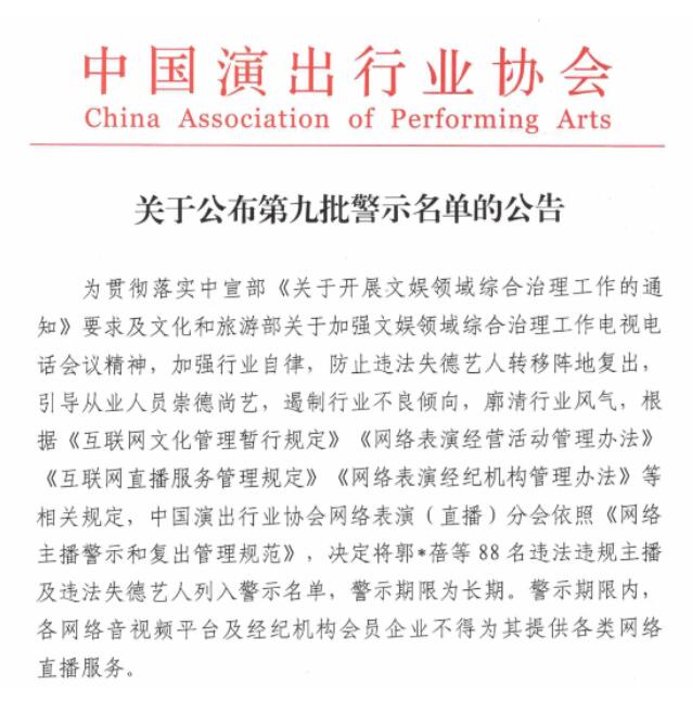 中國演出行業(yè)協(xié)會網(wǎng)絡表演(直播)分會近日發(fā)布了第九批網(wǎng)絡主播警示名單,包括“鐵山靠”“郭老師”兩名職業(yè)主播和“吳亦凡”“鄭爽”“張哲瀚”三名演員在內(nèi)的88名主播將在行業(yè)內(nèi)被實行聯(lián)合抵制和懲戒。這是違法失德藝人首次被納入網(wǎng)絡主播警示名單中,防止劣跡藝人轉移陣地復出。