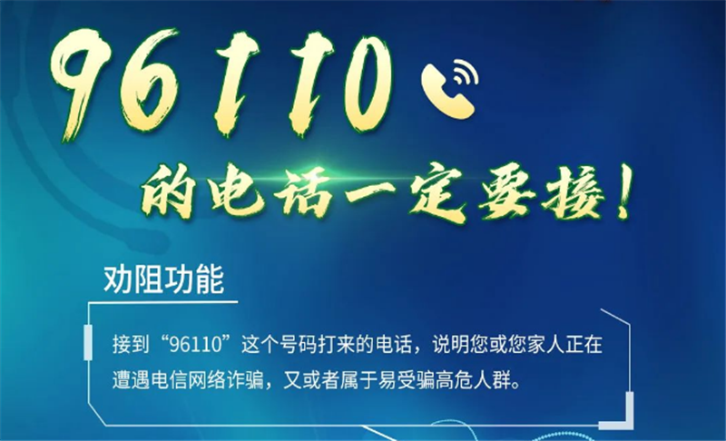 公安機關(guān)提醒:96110是官方預(yù)警勸阻專線,如接到“96110”號碼來電,說明機主本人或其家人正遭遇電信網(wǎng)絡(luò)詐騙,請一定及時接聽并耐心聽取民警的勸阻提示,避免上當(dāng)受騙。