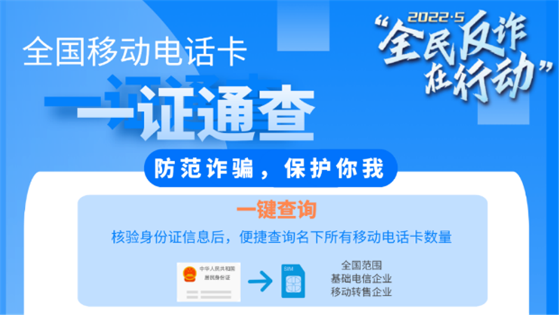 詐騙分子冒用他人身份開辦電話卡嚴(yán)重侵害用戶本人合法權(quán)益,廣大群眾對此深惡痛絕。“一證通查”服務(wù)打通了93家省級基礎(chǔ)電信企業(yè)和39家移動通信轉(zhuǎn)售企業(yè)相關(guān)數(shù)據(jù),群眾只需要使用自己的居民身份證,即可通過線上線下多種渠道查詢本人名下持有的全國移動電話卡數(shù)量,專用短信端口10699000將在48小時內(nèi)向預(yù)留手機號反饋結(jié)果,真正實現(xiàn)了全國移動電話卡的統(tǒng)一便捷查詢。