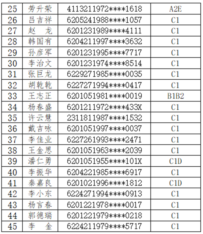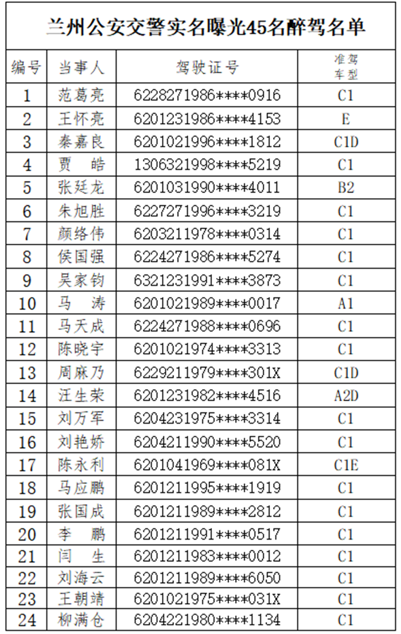 今年以來,蘭州市共查處酒醉駕1249起。其中,飲酒駕駛721起,醉酒駕駛528起。6月以來,又查處酒醉駕案件50起。然而,還是有人心存僥幸,甚至酒醉駕駕車引發(fā)道路交通事故。為進一步加強交通安全宣傳和警示教育,強化社會監(jiān)督,蘭州公安將近期查獲的45名醉酒駕駛機動車人員予以曝光,名單如下: