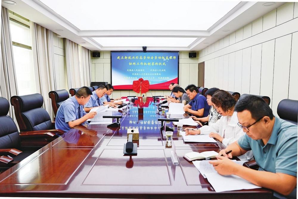民勤縣檢察院邀請法院、人社、司法、工會、婦聯(lián)等部門單位召開座談會,共同簽訂《關于建立新就業(yè)形態(tài)勞動者勞動權益保障協(xié)同工作機制的意見》(2024年6月7日拍攝)。