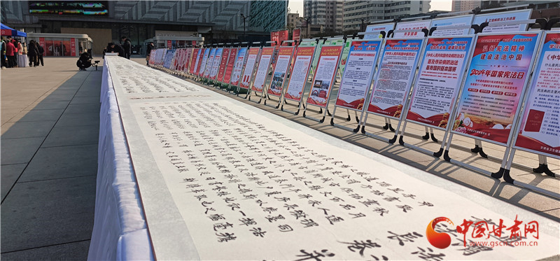 活動(dòng)現(xiàn)場,省委宣傳部、省委政法委、省法院、省檢察院等20余家單位結(jié)合行業(yè)實(shí)際,宣傳憲法,普及法律知識,為群眾提供法律咨詢。為了豐富普法載體,讓群眾在互動(dòng)參與中學(xué)習(xí)法律知識,活動(dòng)展出了由定西市通渭縣司法局聯(lián)合書法家、師生群體、法官、檢察官、公安民警等各行各業(yè)工作人員創(chuàng)作的百米《書·法》長卷,鐫刻法治精神,書寫法律法規(guī)?,F(xiàn)場還表演了精彩的文藝節(jié)目。