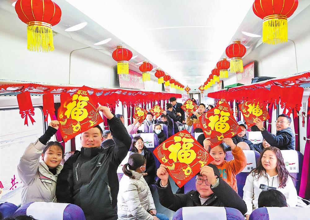 7504次“富民號”列車上張燈結(jié)彩,歡聲笑語。新春佳節(jié)來臨之際,無數(shù)人心懷著對家鄉(xiāng)的眷戀,踏上溫馨的回家之路。 新甘肅·甘肅日報(bào)記者丁凱攝
