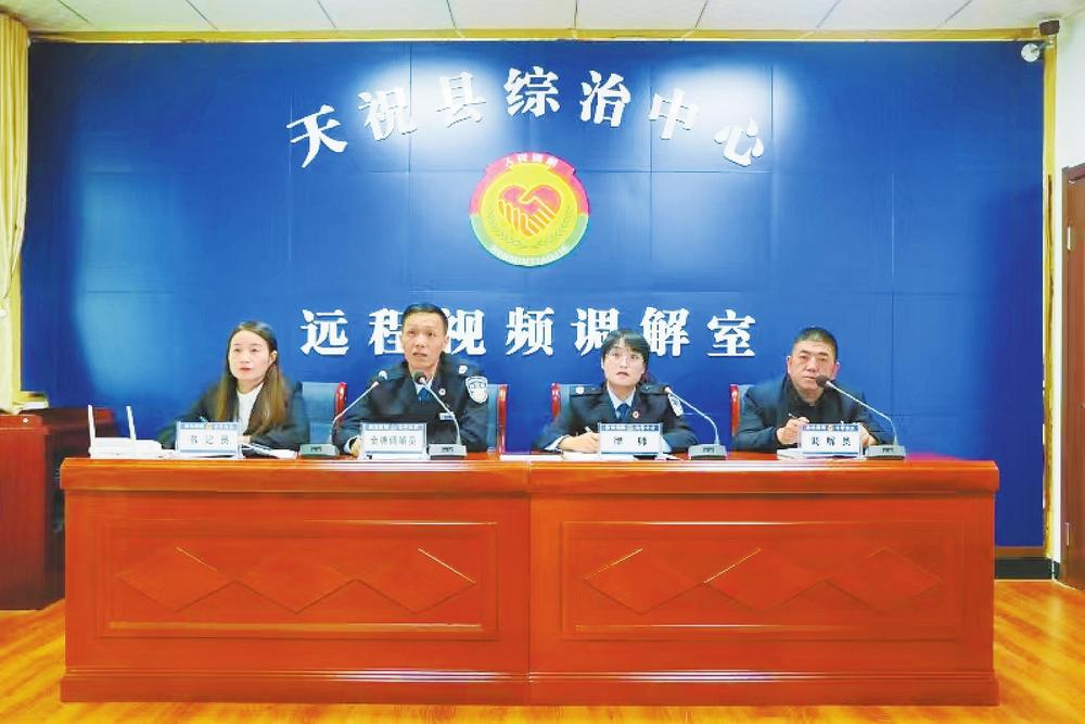 天??h綜治中心組織金牌調(diào)解員、律師等在遠(yuǎn)程視頻調(diào)解室為群眾調(diào)解矛盾(資料圖)。