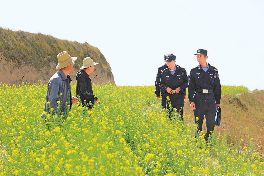 民警田間地頭走訪群眾。5月15日,定西市公安局安定分局組織民輔警開展社情民意大走訪,面對(duì)面傾聽(tīng)群眾呼聲、征求群眾意見(jiàn),解決實(shí)際困難,宣講安全知識(shí),不斷增強(qiáng)人民群眾的獲得感、幸福感、安全感。  新甘肅·甘肅法治報(bào)通訊員楊永剛攝