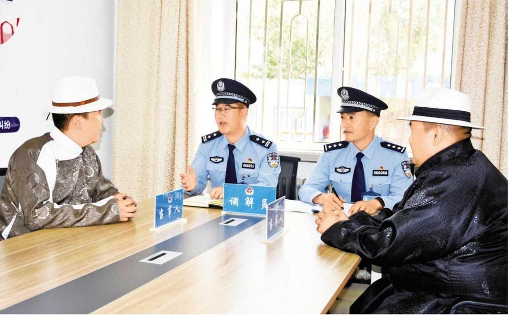 肅北縣公安局黨城派出所民警為牧民調(diào)解矛盾糾紛(2024年5月21日拍攝)。 肅北縣委政法委供圖
