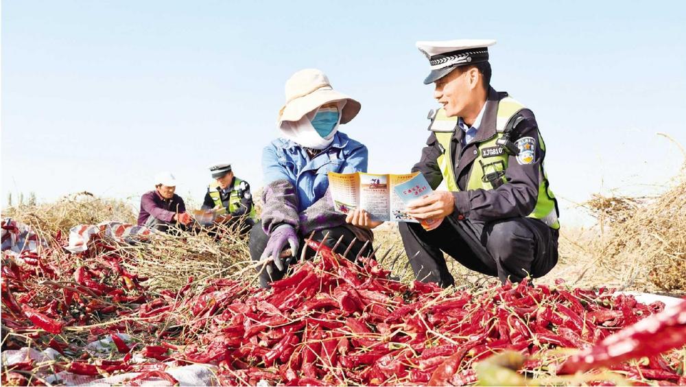 民警在田間地頭向群眾講解交通安全知識。近日,高臺縣公安局交通管理大隊駱駝城交警中隊民輔警通過發(fā)放宣傳資料、以案釋法、與村民面對面交流等方式,宣傳道路交通安全法律法規(guī),維護好豐收季節(jié)農(nóng)村道路交通秩序。新甘肅·甘肅法治報通訊員 蔣雯麗 攝