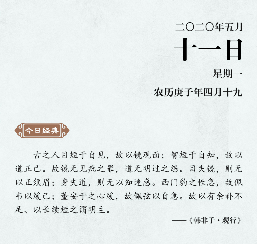 古代的人因?yàn)檠劬Σ荒芸匆娮约旱哪?,所以用鏡子觀察面容;因?yàn)橹腔鄄蛔阋园l(fā)現(xiàn)自己的過失,所以用道端正自己。所以鏡子不會(huì)因?yàn)檎粘鲥e(cuò)誤而被怪罪,道不會(huì)因?yàn)槭惯^錯(cuò)公開而遭到怨恨。眼睛失去鏡子,就不能夠端正面容;人失去道,就無法知道是非對錯(cuò)。西門豹性子急躁,所以佩戴柔韌的皮帶,提醒自己應(yīng)該從容沉著;董安于性格溫緩,所以佩戴繃緊的弓弦,提醒自己應(yīng)該保持警醒。因此用有余補(bǔ)齊不足,用其所長來續(xù)接其短,這就叫明主。